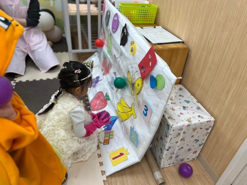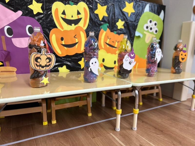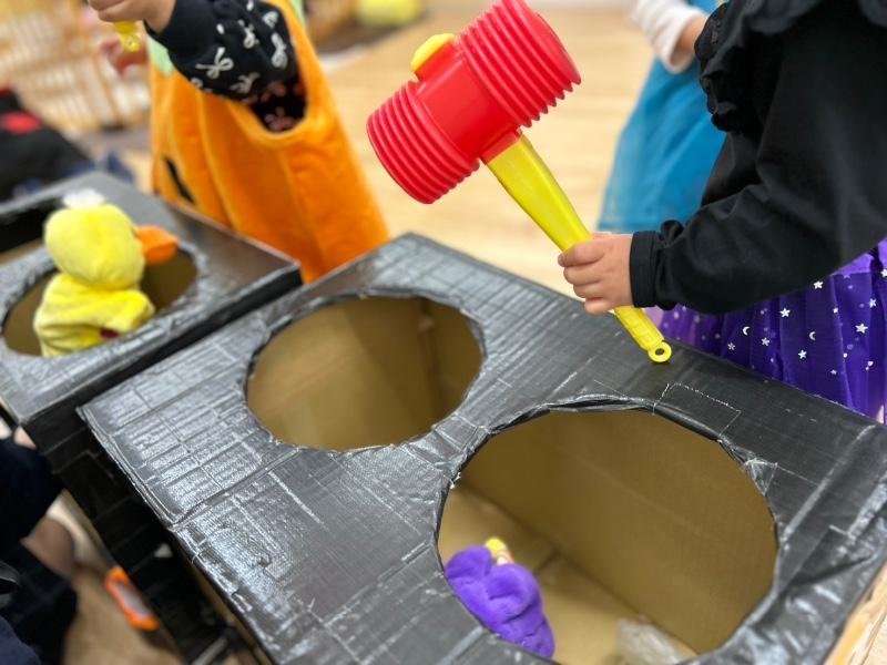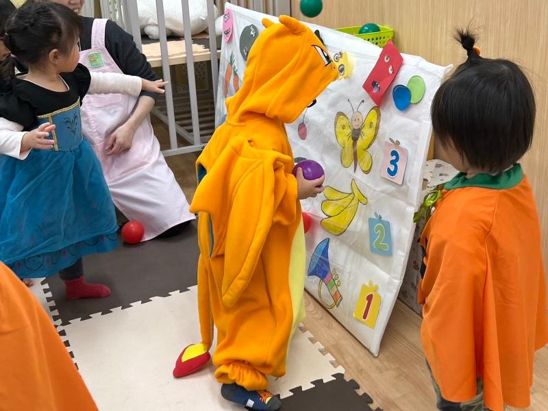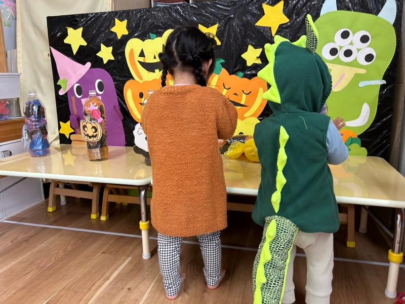 保育者手作りのハロウィン風の的当てやボーリング、モンスター叩きを楽しみました♪