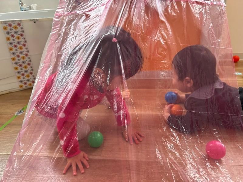 洗面器やタライにボールを集めたり カラービニール袋で作ったスロープ目掛けてボールを「えいっ!!」