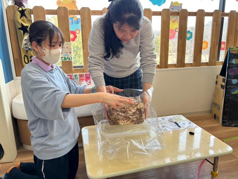 初めて見るしいたけの栽培キットに、「これなに?」と、興味津々の子ども達(*^^*)